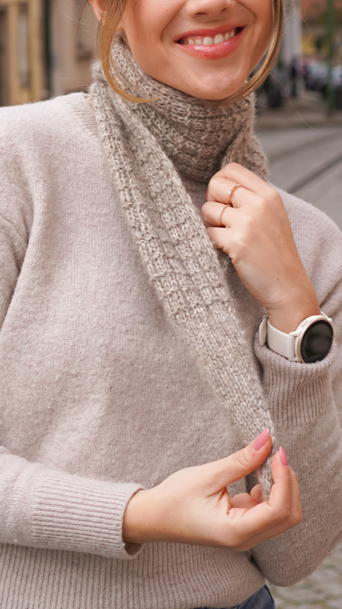 Der Schal wird ca. 10 cm breit und ca. 120 cm lang, kann aber jederzeit kürzer oder länger gestrickt werden – ganz nach persönlichem Geschmack. Die Spitzen werden glatt rechts gestrickt und durch Zunahmen bzw. Abnahmen sauber geformt. Im Mittelteil sorgt ein wiederholtes Muster dafür, dass die Oberfläche auf beiden Seiten spannend aussieht. So entsteht ein echter 2-in-1 Schal, den du einfach wenden kannst – je nachdem, welcher Look gerade besser passt.