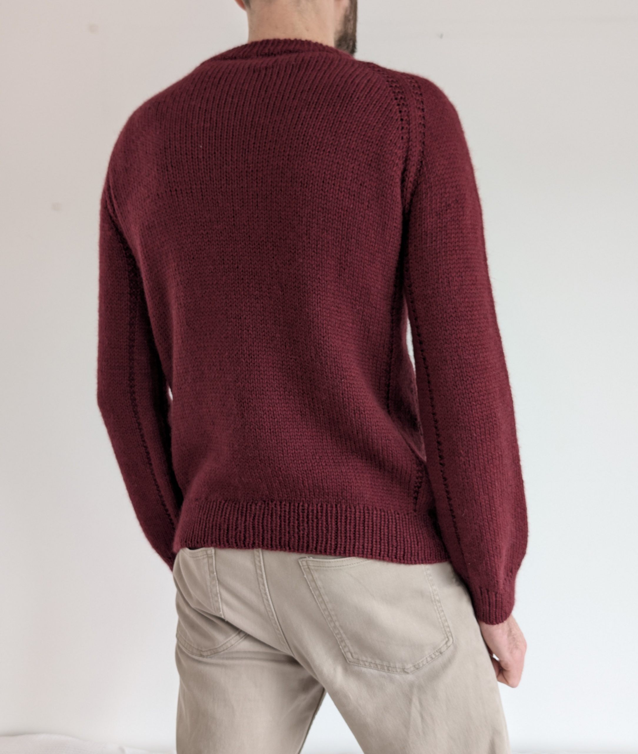 Der Pullover wird nahtlos von oben nach unten gestrickt. Die Passe entsteht durch gleichmäßige Raglan-Zunahmen. Besonders ins Auge fallen die markanten Raglanlinien, die wie eingefasste Streifen wirken und harmonisch in Rumpf und Ärmel übergehen. Sie verleihen dem schlichten Design eine moderne, strukturierte Optik.