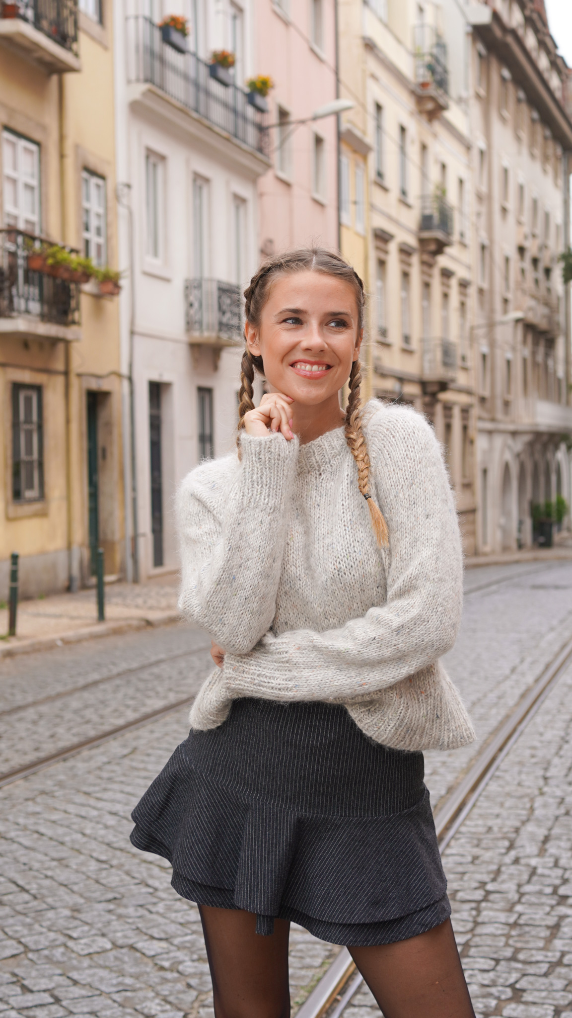 Info: Das Model trägt die Farbe 002 (Alpaca Pelo) und 614 (Superkid Tweed).